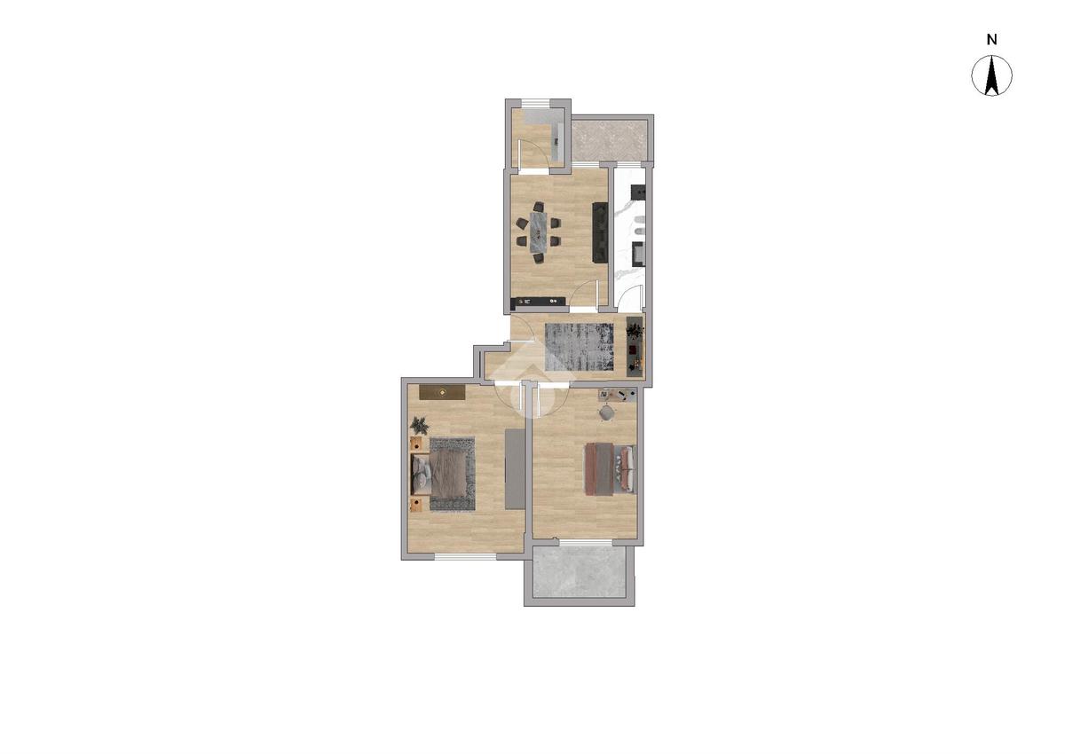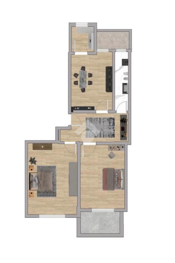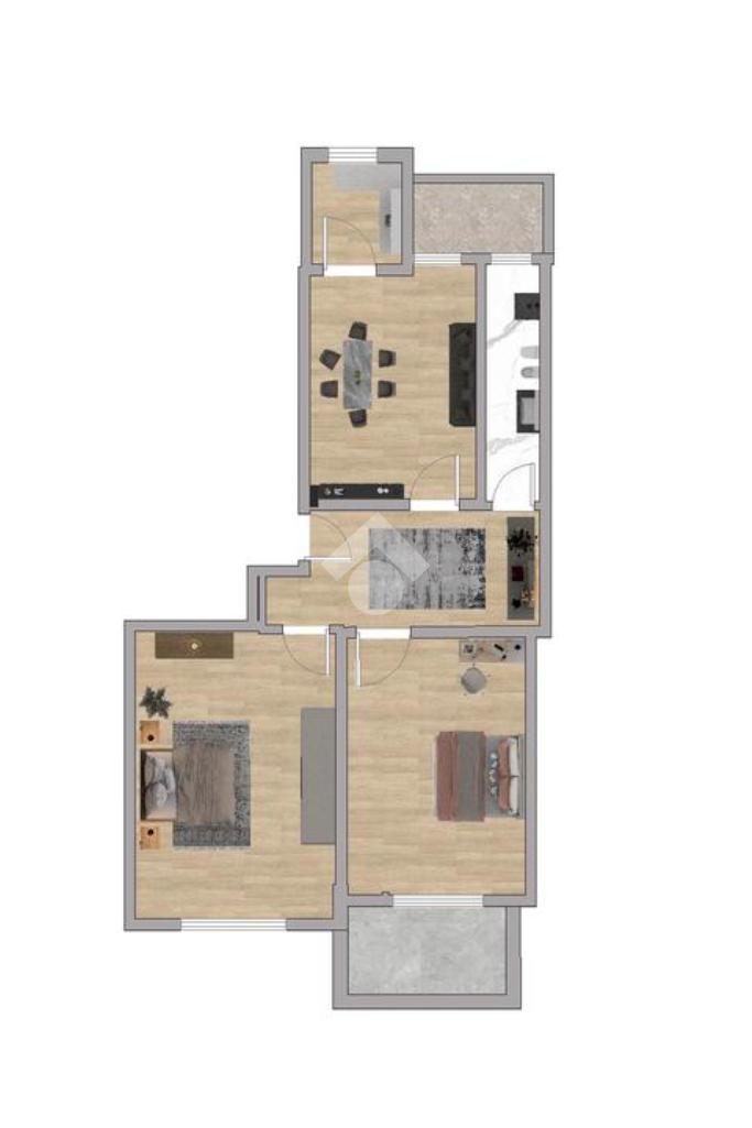 L'immobile si apre su un ingresso che conduce al soggiorno con cucinino, con accesso a un balcone vivibile. La zona notte comprende due camere da letto di generose dimensioni, una delle quali con affaccio su un secondo balcone, e un bagno completo di vasca. Il riscaldamento è centralizzato con gestione autonoma tramite termovalvole.