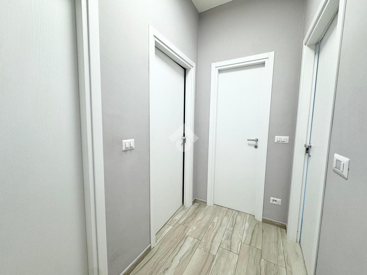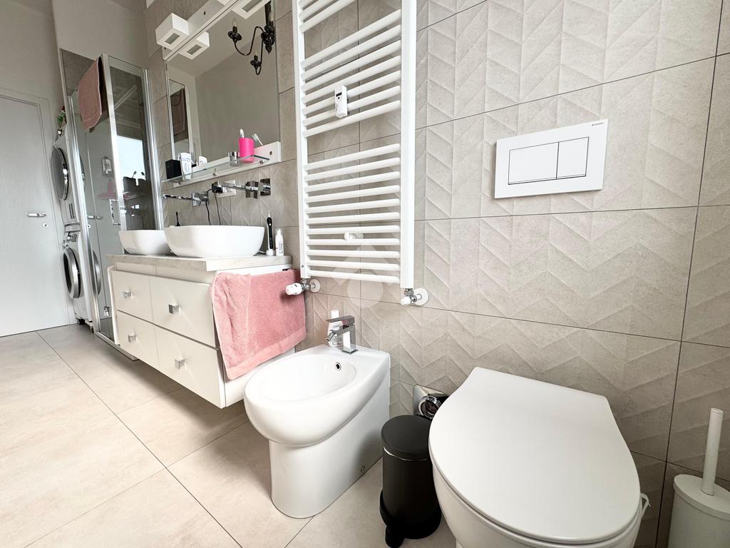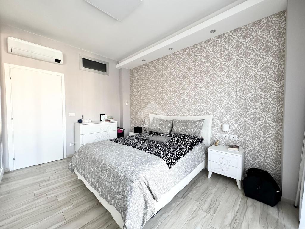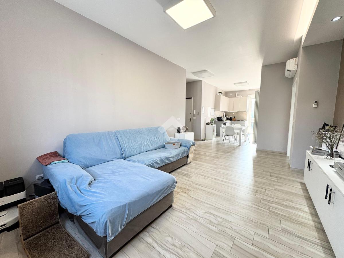 L'appartamento è composto internamente da ingresso living su zona giorno con cucina e affaccio su un primo balcone, due camere da letto, una di queste con accesso diretto ad un secondo balcone e doppi servizi.