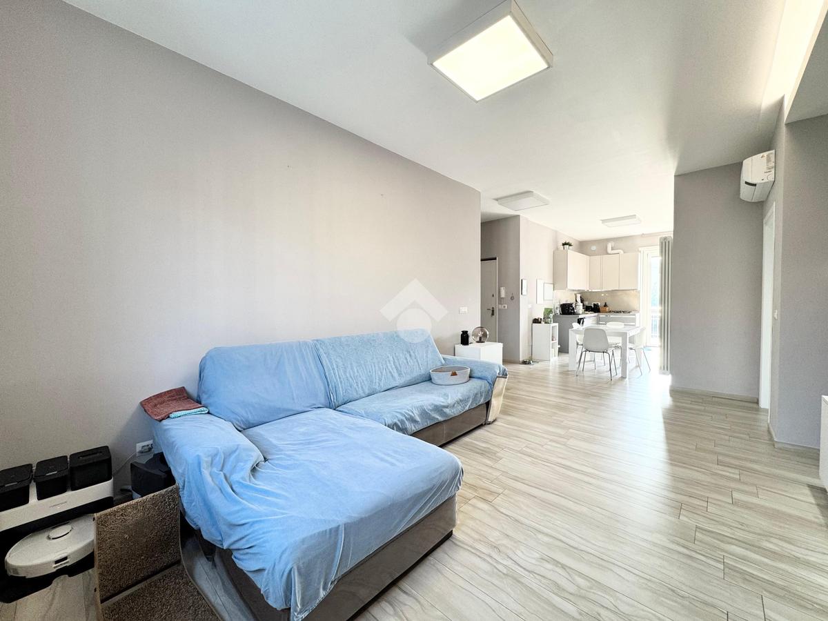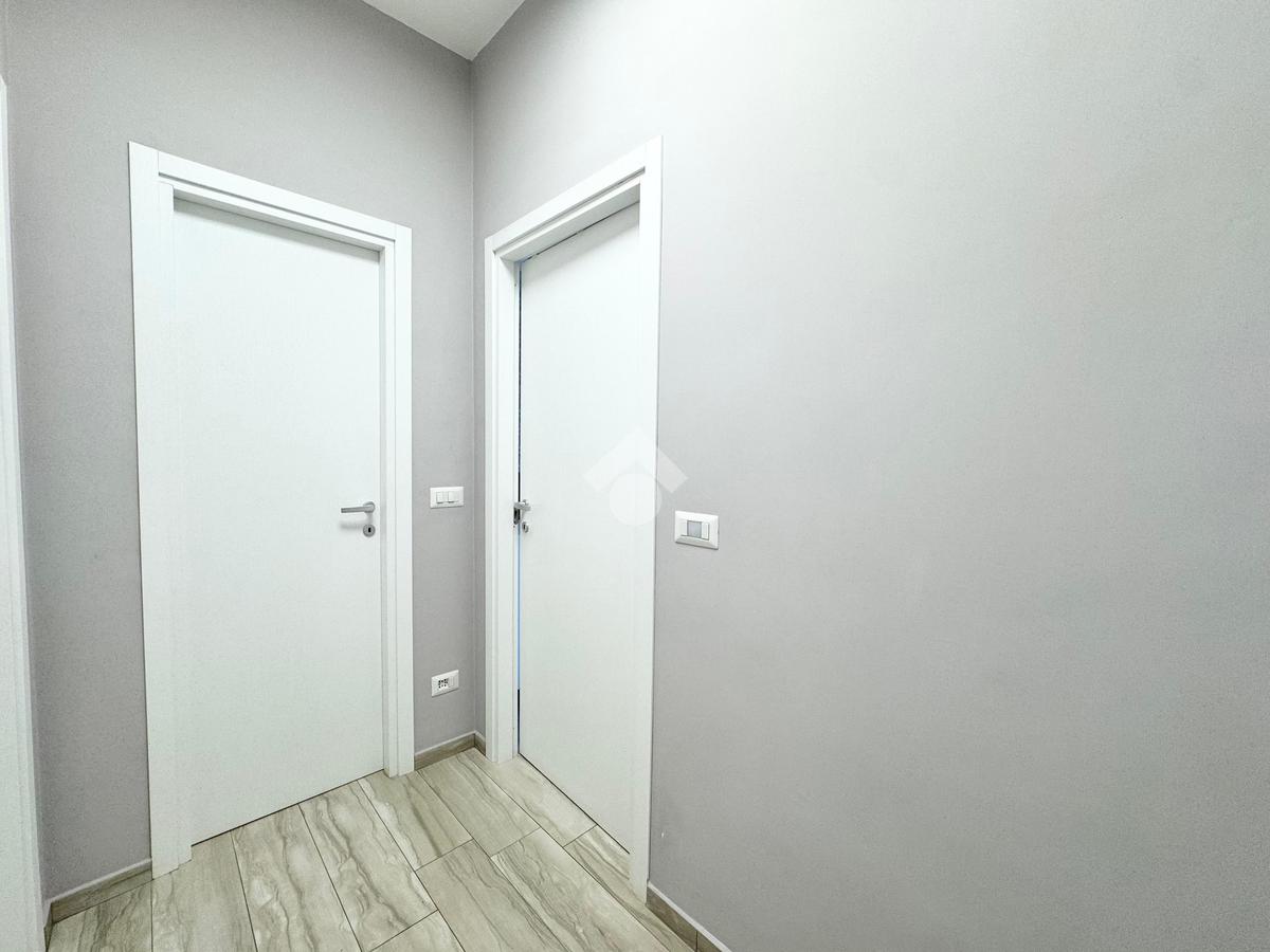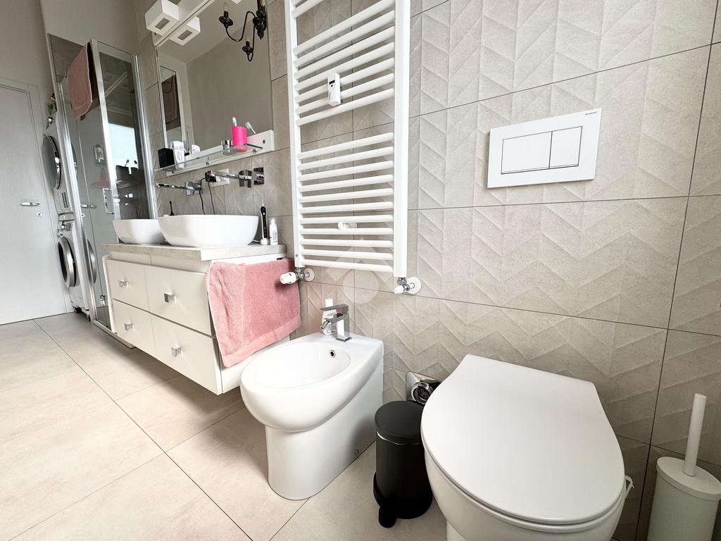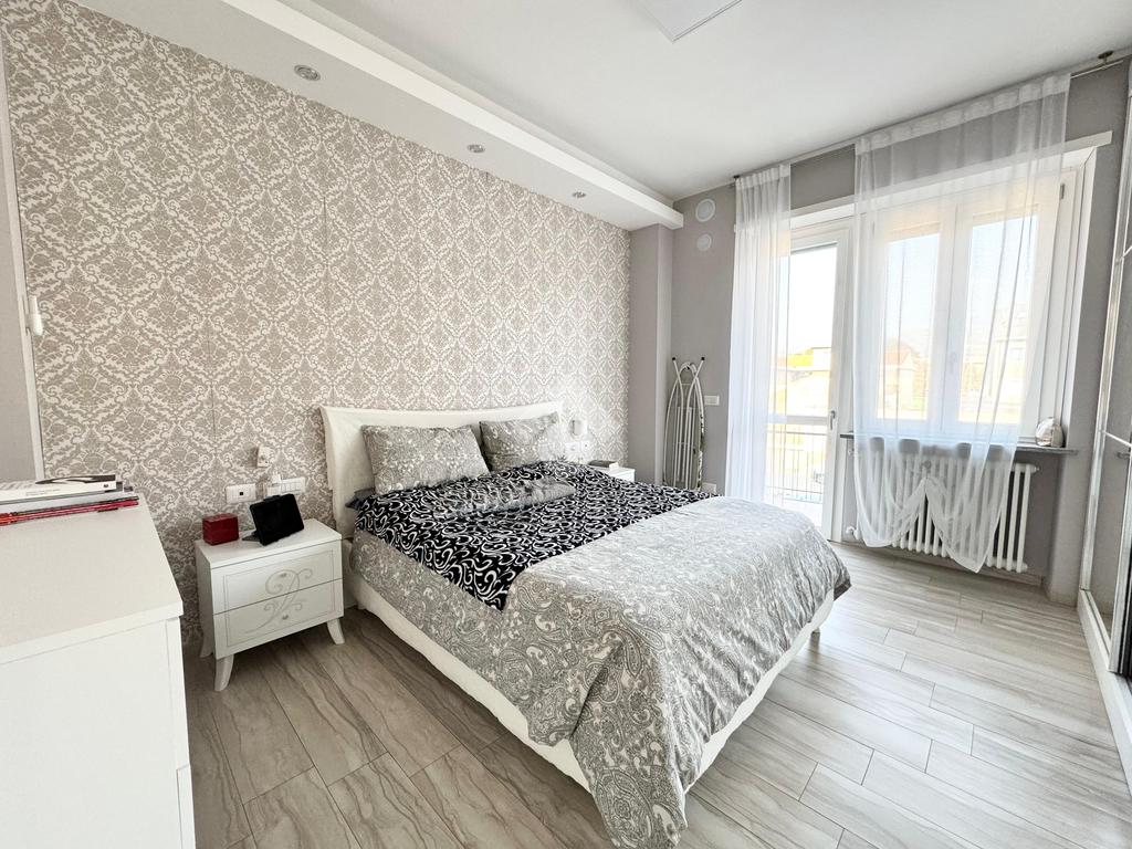 L'appartamento è composto internamente da ingresso living su zona giorno con cucina e affaccio su un primo balcone, due camere da letto, una di queste con accesso diretto ad un secondo balcone e doppi servizi.